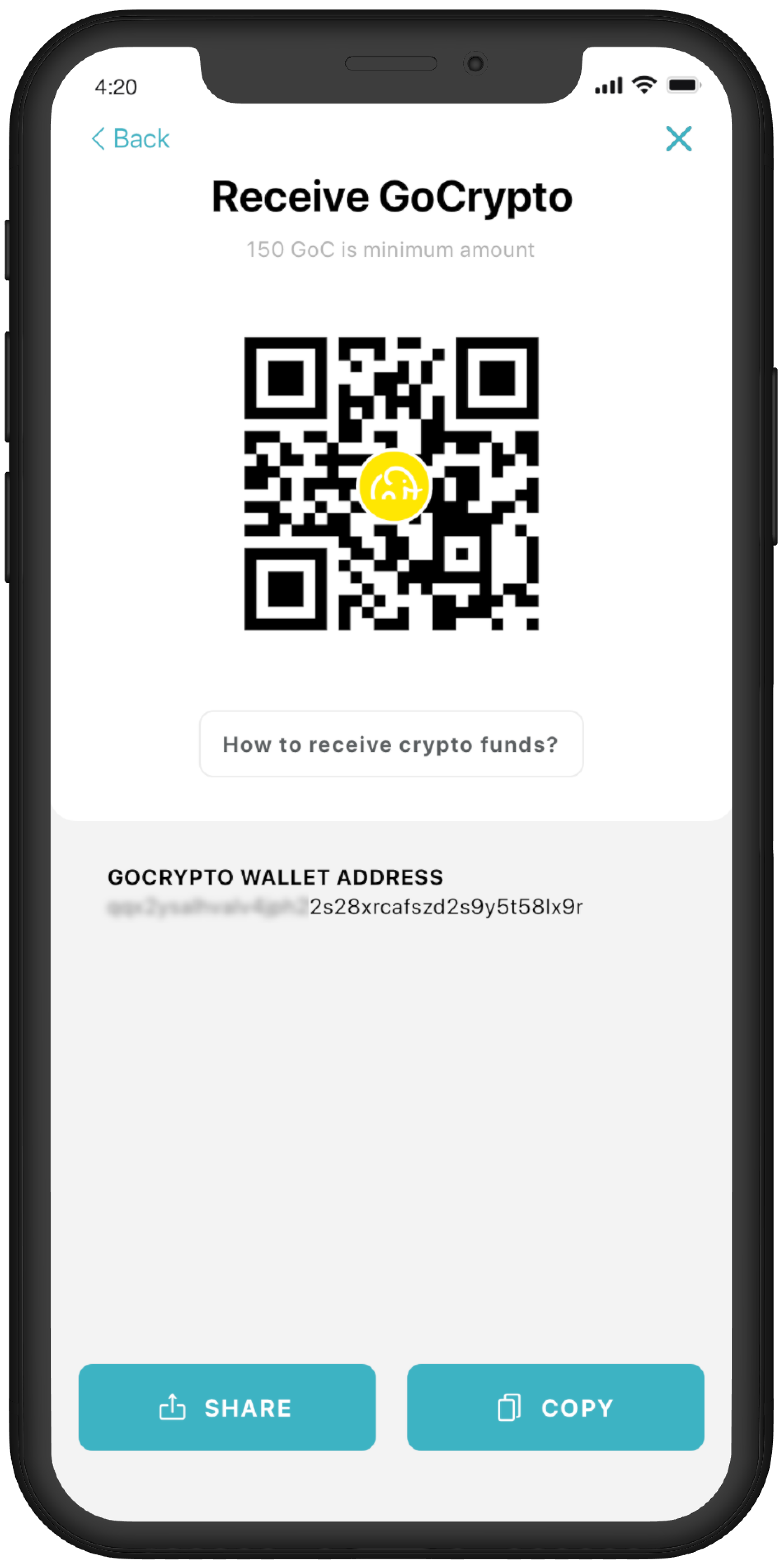 You must now obtain a deposit SLP address, which is either generated inside your wallet or a dedicated GoC deposit address from an online exchange account. Please copy the address to clipboard.